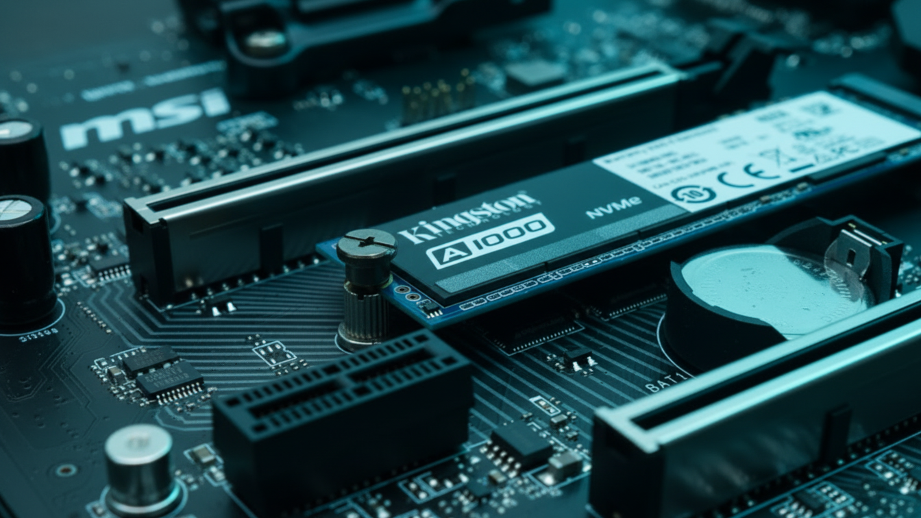 Dysk SSD NVMe w formacie M.2 zainstalowany bezpośrednio na płycie głównej. Taki montaż eliminuje kable sygnałowe i pozwala na bezpośrednią komunikację z procesorem przez magistralę PCIe.